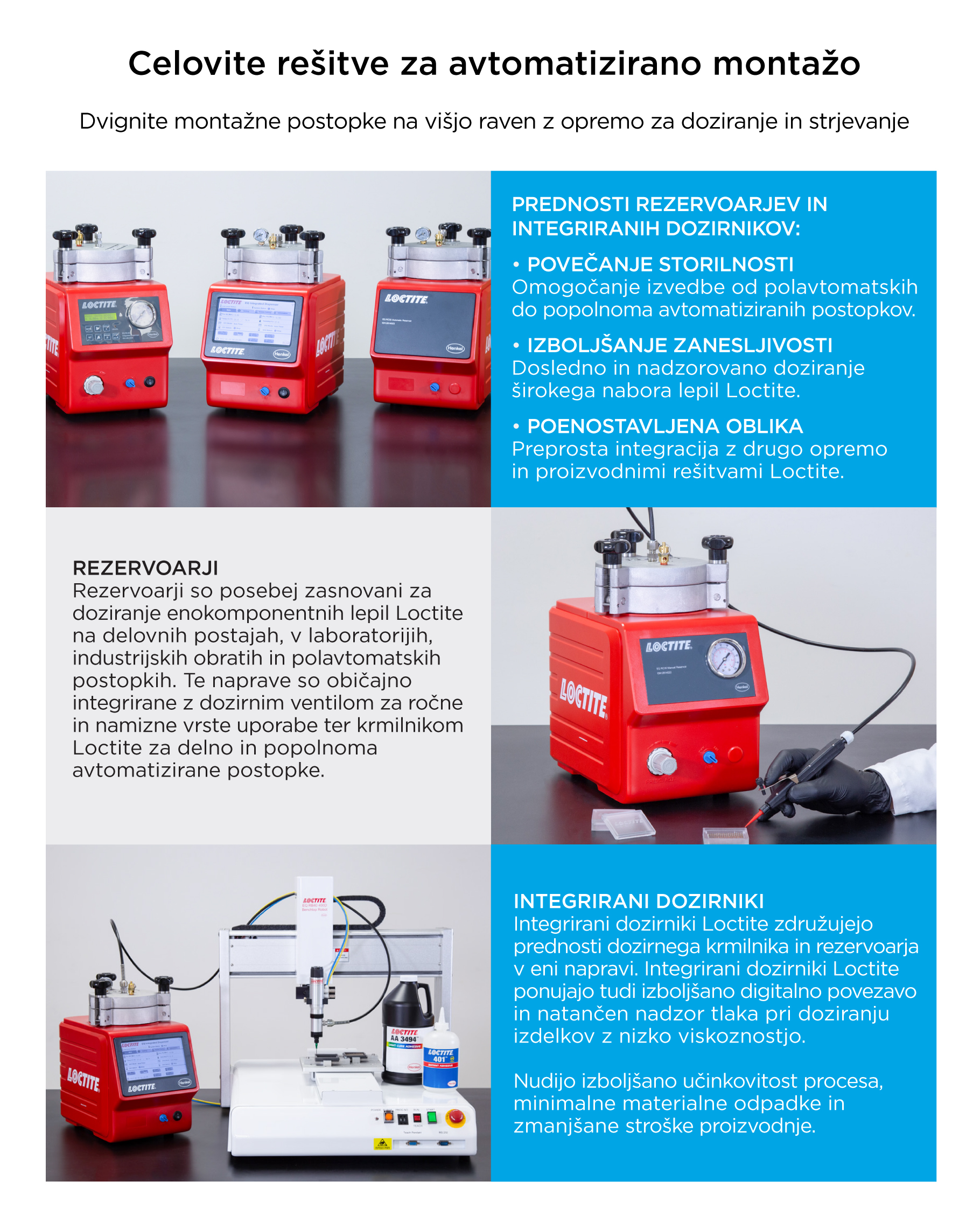 - rezervoarji in integrirani dozirniki Loctite so namenjeni za hitro in preprosto integracijo z drugo opremo Loctite ter zagotavljajo stroškovno učinkovite rešitve doziranja, minimalne materialne odpadke in boljšo učinkovitost v primerjavi z ročnimi načini doziranja;