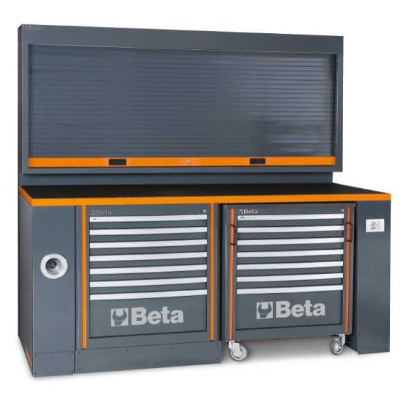 Beta modeli, ki so opremljeni s predalnimi omaricami za shranjevanje orodja, omogočajo urejeno postavitev in obešanje vašega orodja. Ponudba Beta delovnih miz vključuje zložljive, kompaktne modele, ki jih je enostavno prenašati, idealne za povečanje prostora v delavnici.