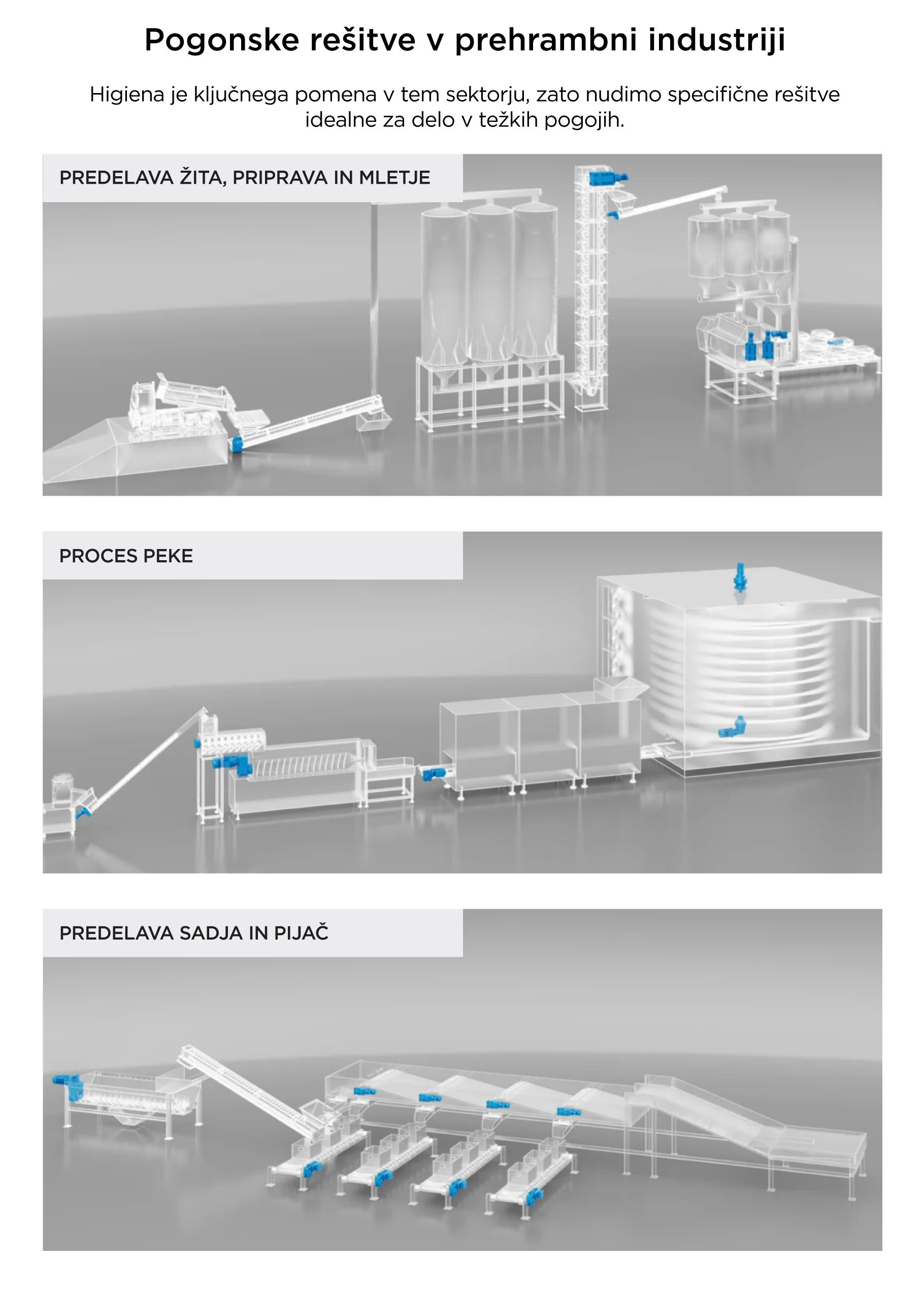 Kot distributer in BEST Partner Bonfigliolia imamo veliko izkušenj z razvojem prilagojenih rešitev za najzahtevnejše aplikacije in usposobljenost na področju predelave hrane in pijače. Poleg standardnih izdelkov Bonfiglioli razvija specifične rešitve za industrijo hrane in pijač. Odlikujejo jih napredna površinska zaščita, komponente, varne za živila in certifikat protieksplozijske varnosti.
