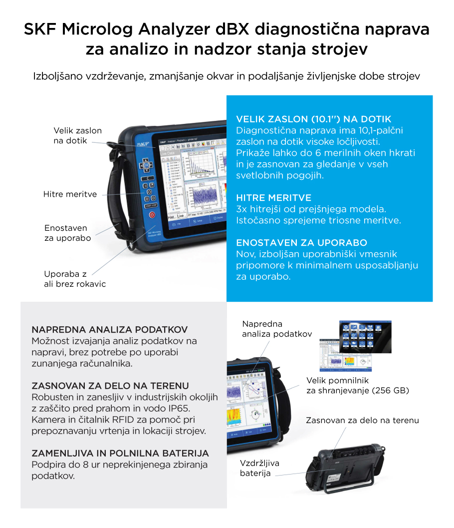 SKF Microlog Analyzer dBX diagnostična naprava za analizo in nadzor stanja strojev nudi izboljšano vzdrževanje, zmanjšanje okvar in podaljšanje življenjske dobe strojev.
