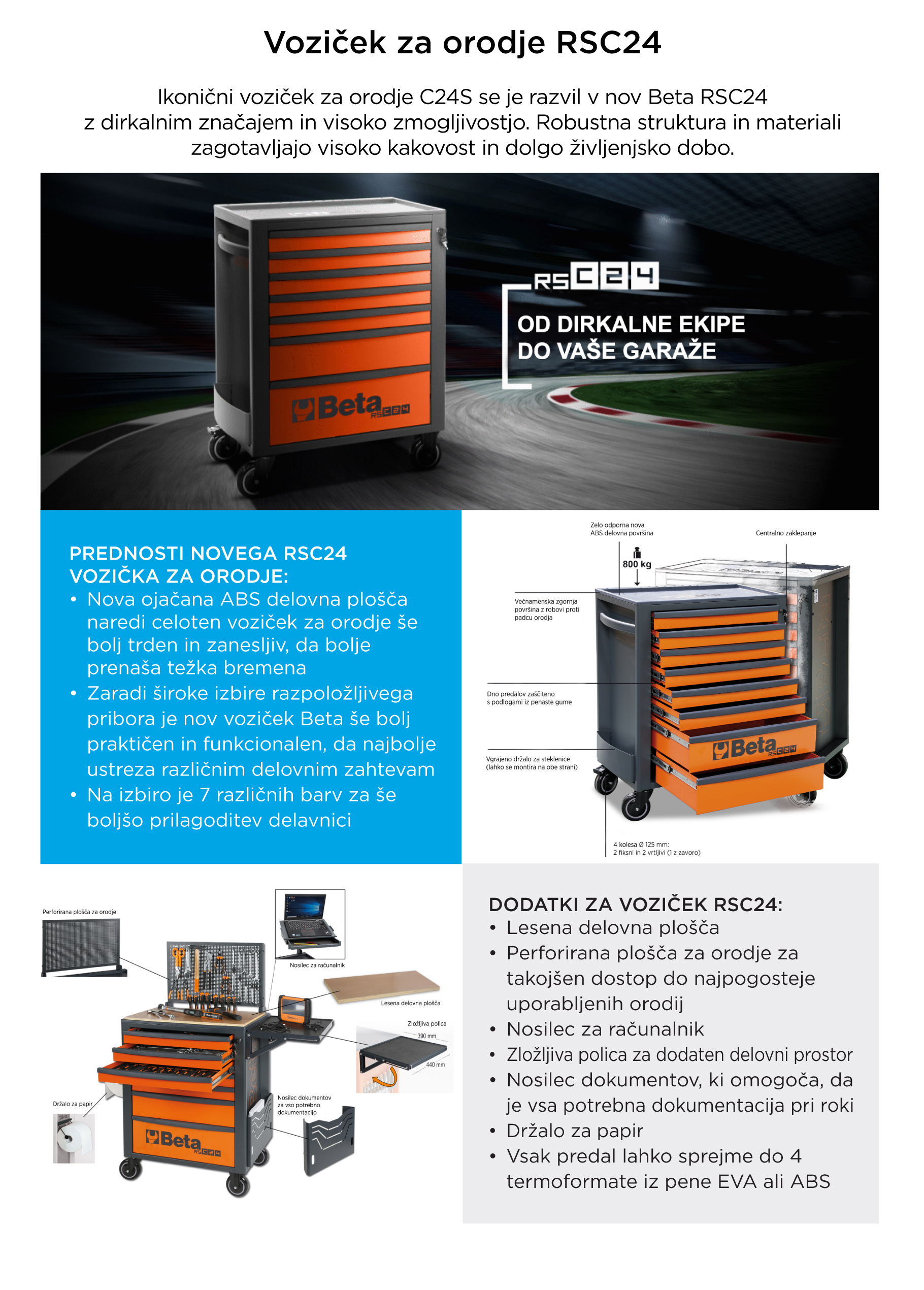 Ikonični voziček za orodje C24S se je razvil v nov Beta RSC24 z dirkalnim značajem in visoko zmogljivostjo. Robustna struktura in materiali zagotavljajo visoko kakovost in dolgo življenjsko dobo.